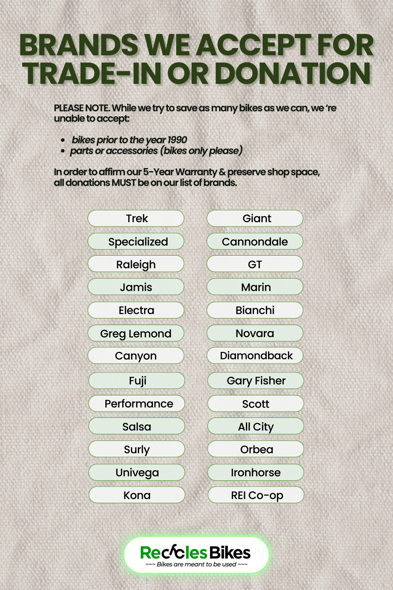 We’ll always happily service any bike, but for trade-ins, these standards keep our community rides safe, reliable, and affordable.